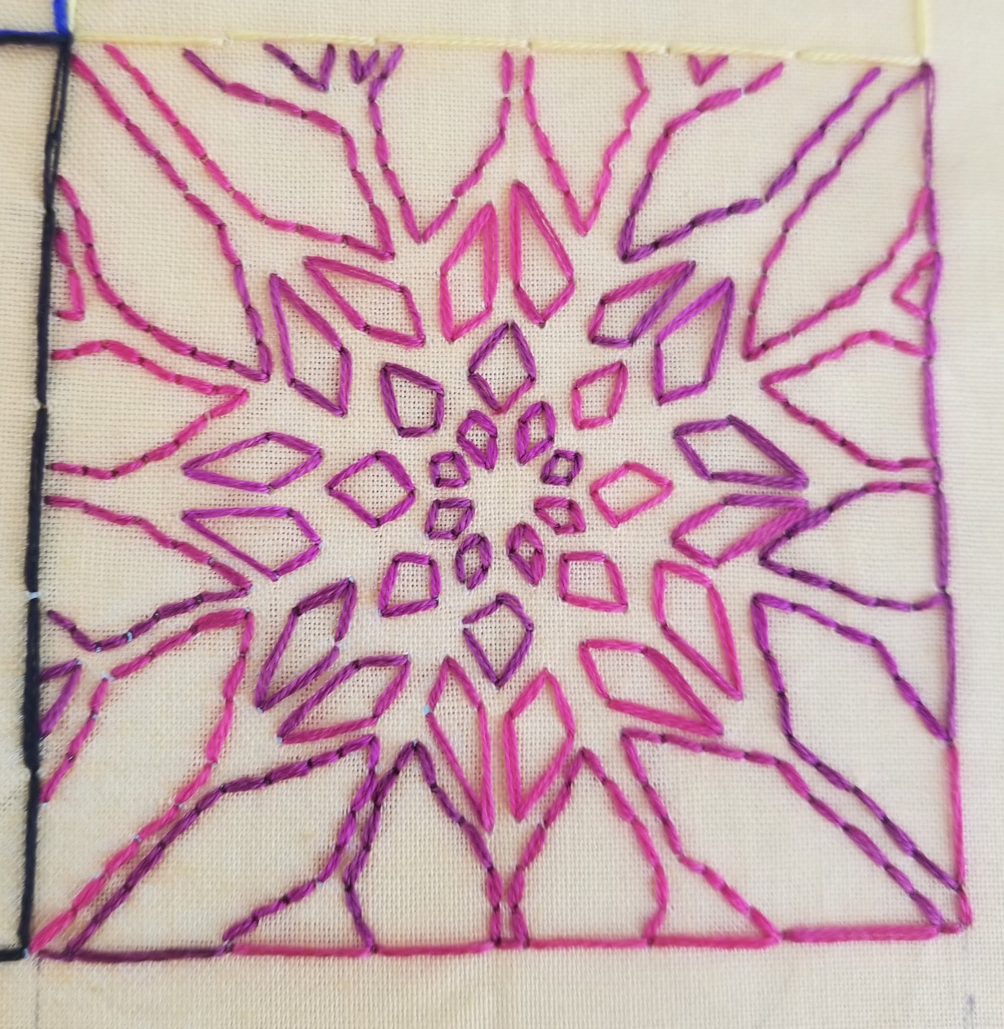 Today's design is a modification of a mandala stencil I have. I realized after starting how much it resembles a snowflake, so I may have to do it again sometime in the winter in a more snow-like palette.